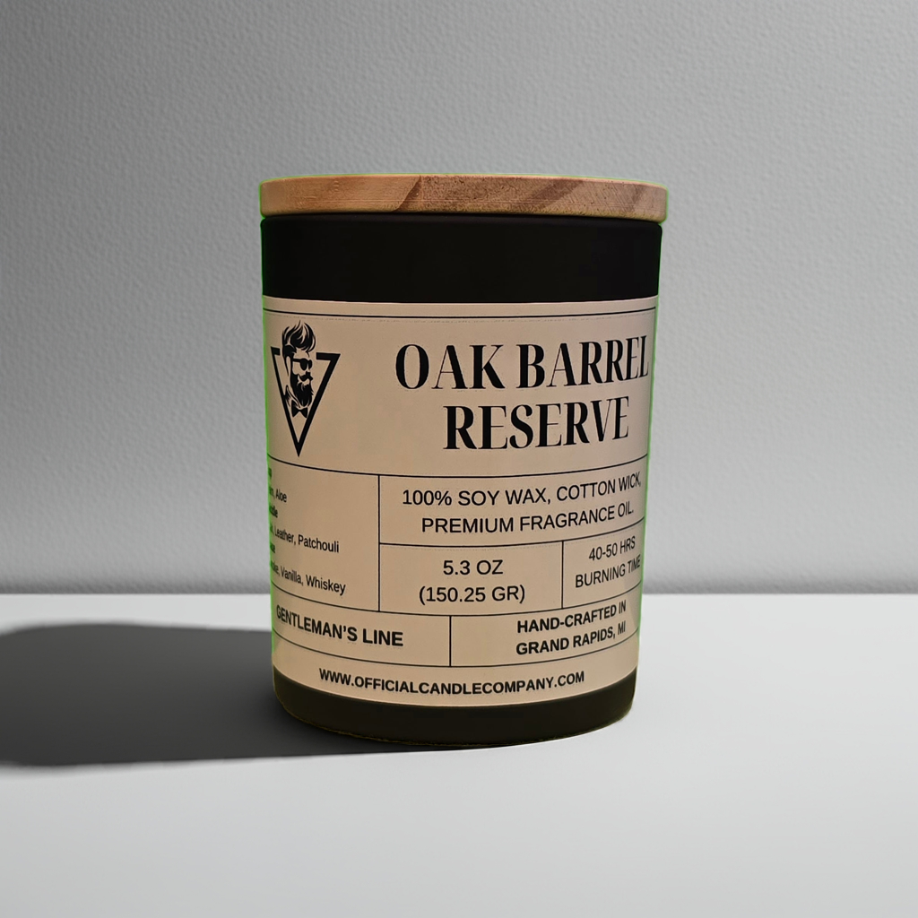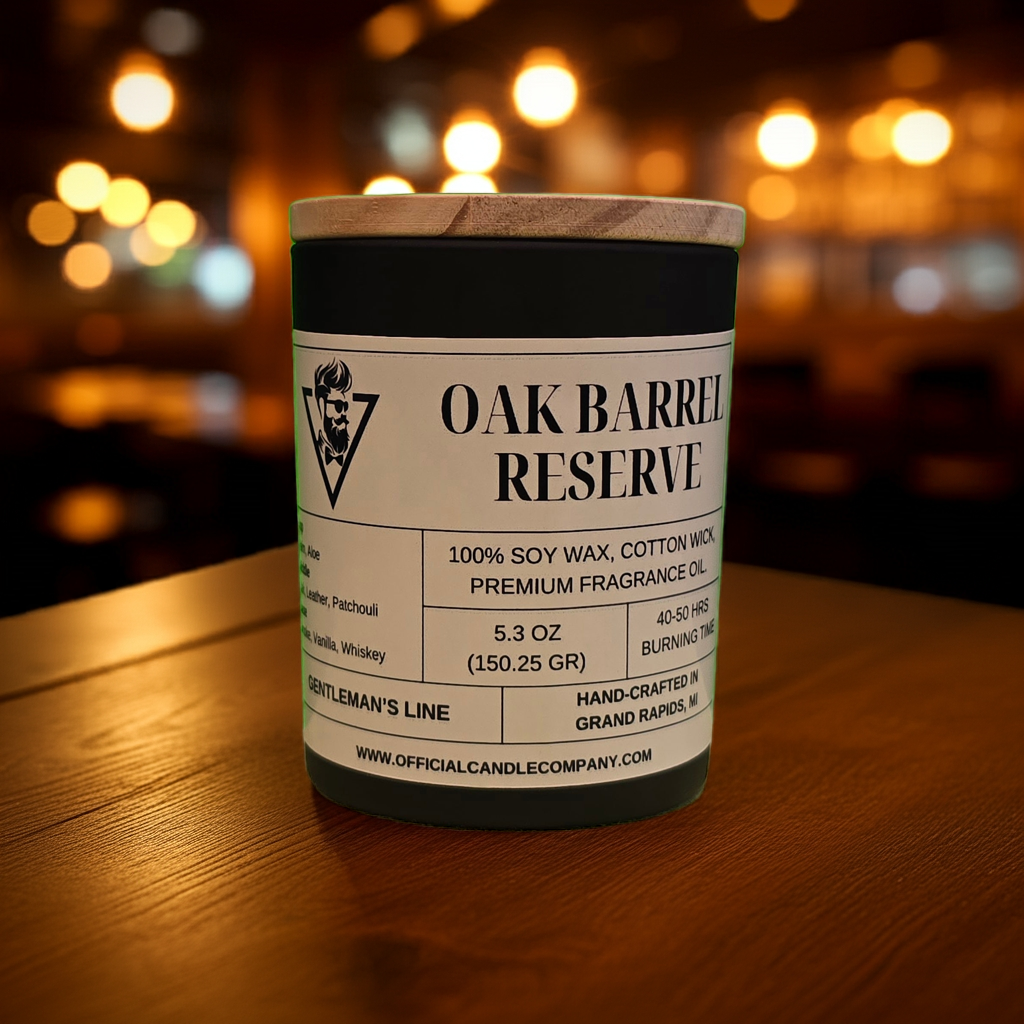 The Oak Barrel Reserve candle offers a refined, timeless scent inspired by the rich, aged aroma of whiskey barrels. Warm notes of charred oak, smooth bourbon, and subtle vanilla blend with hints of patchouli, palm, aloe and dark leather, creating a luxurious and masculine fragrance reminiscent of a vintage distillery. Perfect for setting a cozy, sophisticated ambiance, this candle captures the essence of well-crafted spirits aging in oak barrels, evoking a sense of heritage and tradition. Light the Oak Barrel Reserve candle and savor the comfort of its rich, smoky aroma that adds depth and character to any room.